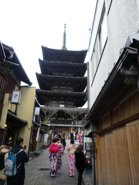 清水道バス停から道幅狭い坂を上ると八坂の塔が見えてきます。古い建物なので中にはたぶん入れません。着物を着た若い女性やカップルが多く、日本人よりも外国の観光客がたくさんいたので驚きました。周辺にはお土産店、人力車乗り場あり。