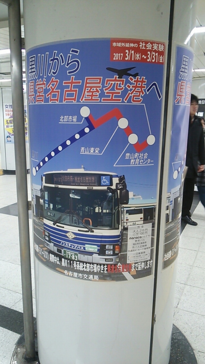2017年3月の期間中、黒川11系統北部市場行きの路線バスが県営名古屋空港まで延長運転を行うそうです。