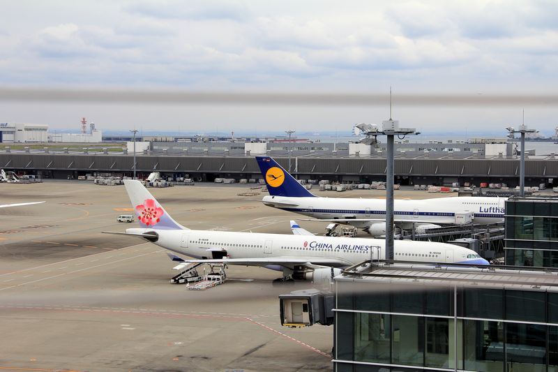 展望デッキからは国際線ターミナルに駐機している飛行機と、A滑走路での離着陸を見ることができました。国際線なので海外のメジャー航空会社の飛行機が駐機しています。