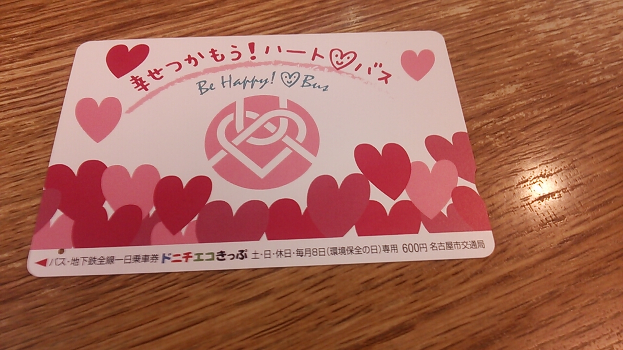 土日のうち好みの1日につき、名古屋市交通局が運営する地下鉄・バスが1日600円で利用し放題となる「ドニチエコきっぷ」という割引切符がありますが、2017年2月26日の日曜日に利用したところ、「幸せをつかもう ハートバス」というデザインが描かれたドニチエコきっぷが発売されていました。