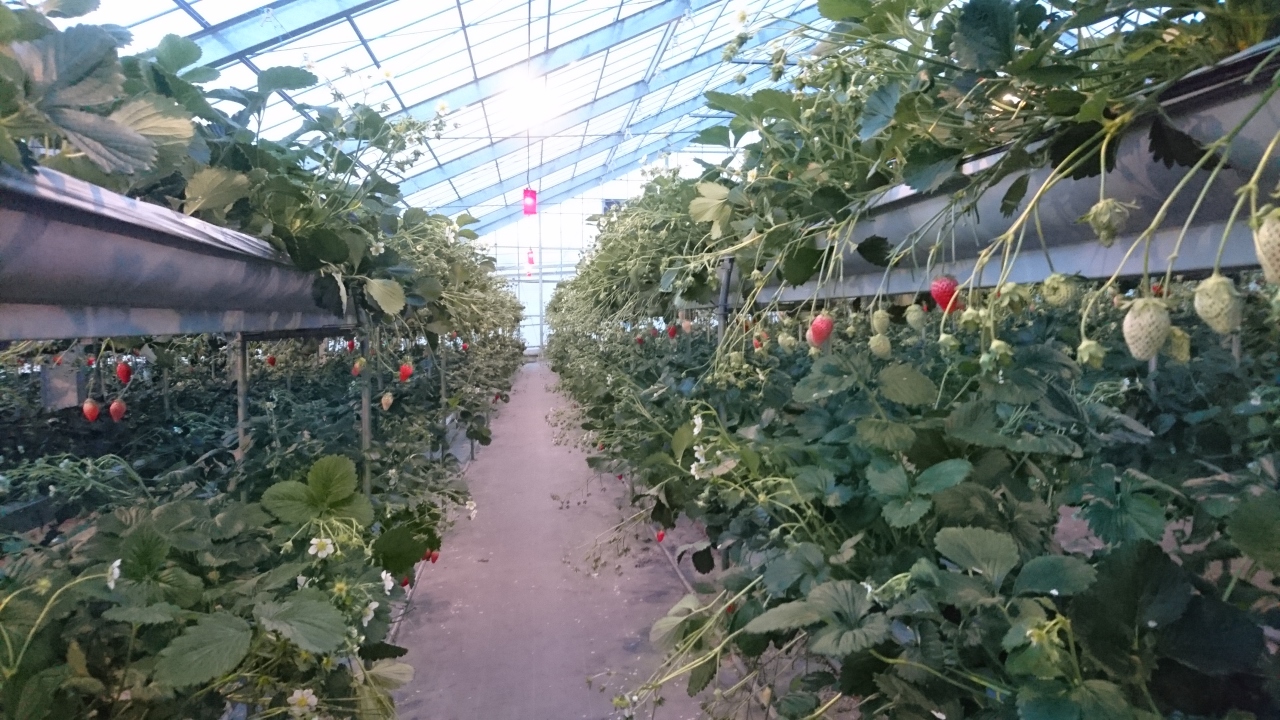 ハウスはとても広く、イチゴは上下に栽培されているが、通路が狭く下段は大人は取りづらいが熟したイチゴはたくさんあった。