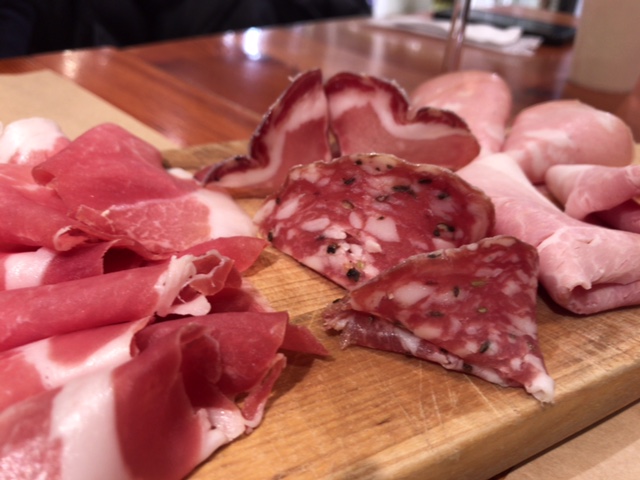 今回注文したのはチーズの盛り合わせ、生ハムやサラミの盛り合わせ、ピッツァ コン ガンベレッティ エ チーメ デイ ラーパというピザを注文