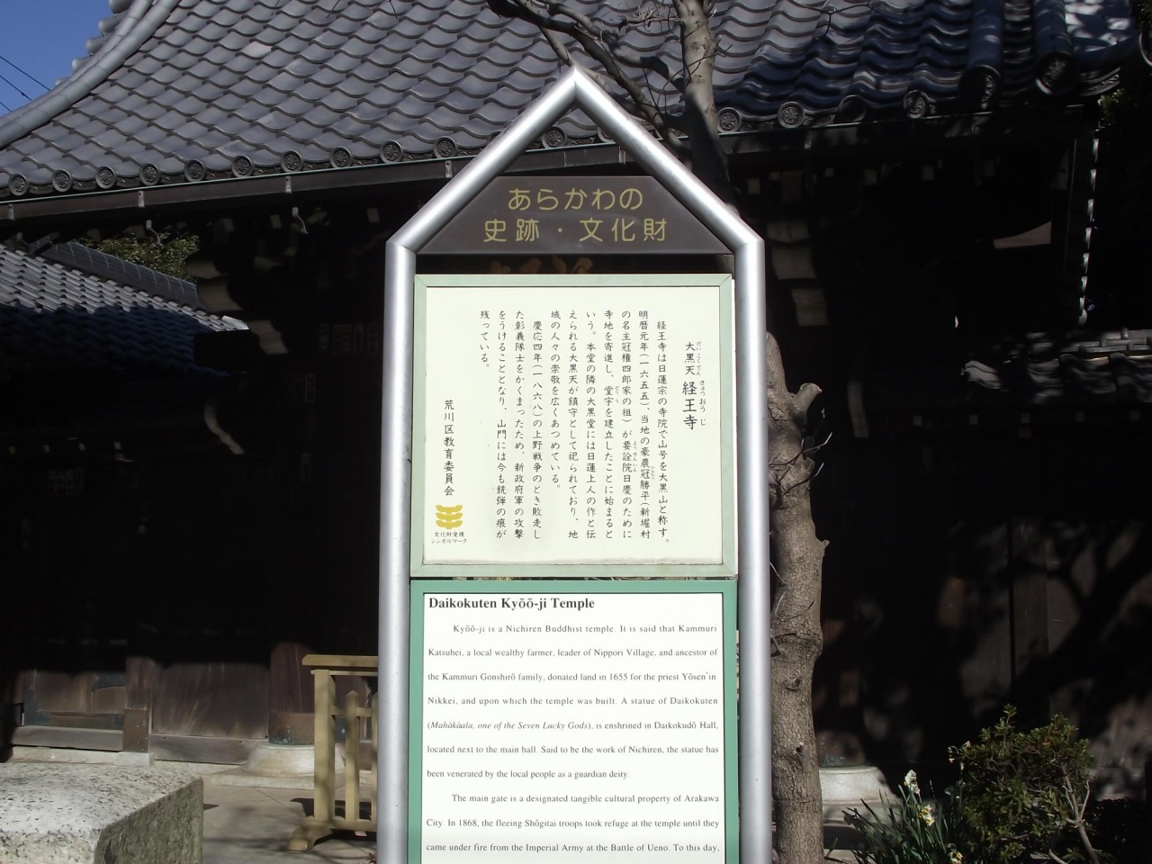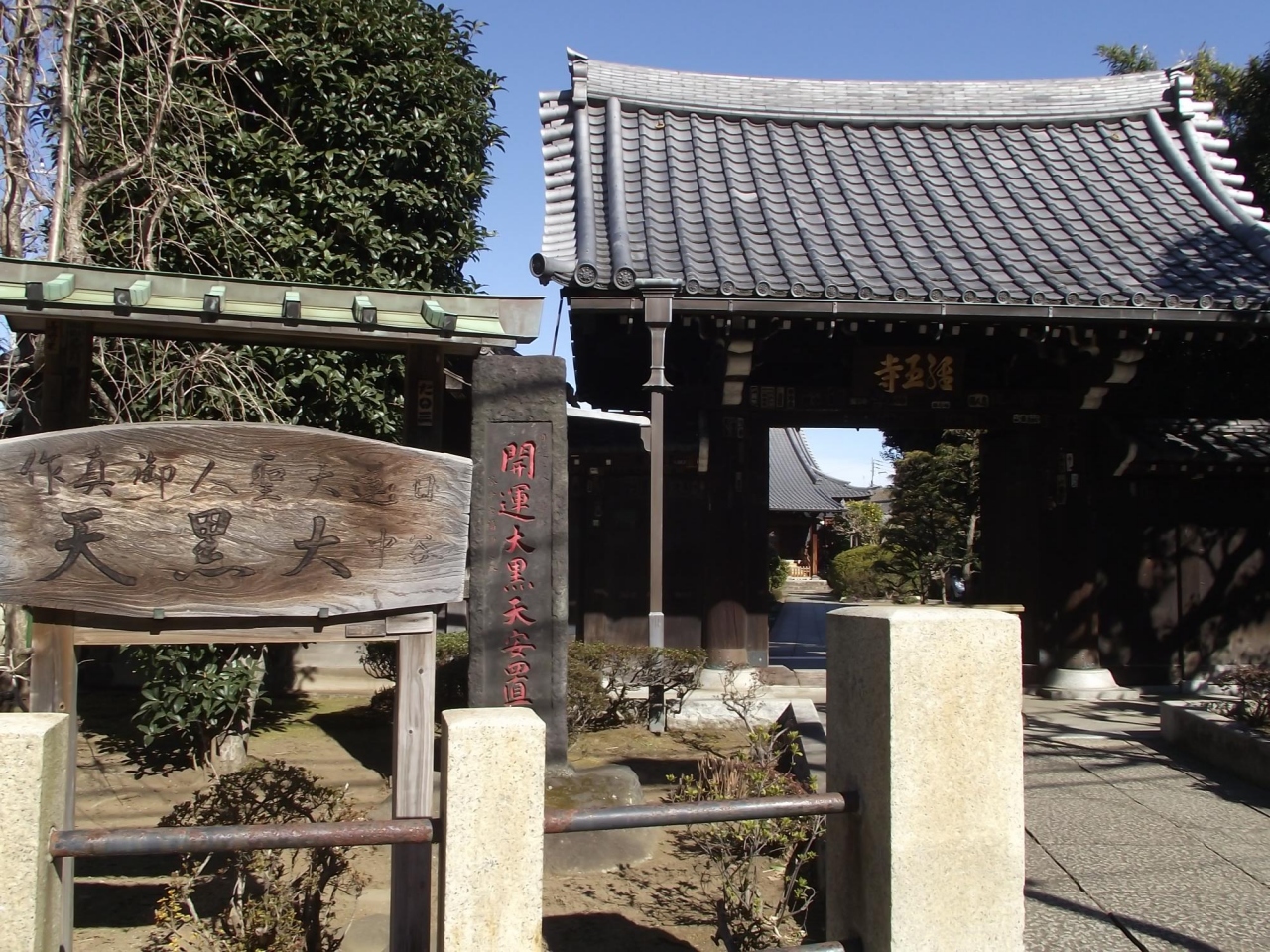 山門左手前には、「日蓮大聖人御真作 谷中 大黒天」 と右横書きの歴史を感じる木札などが立ててあります。