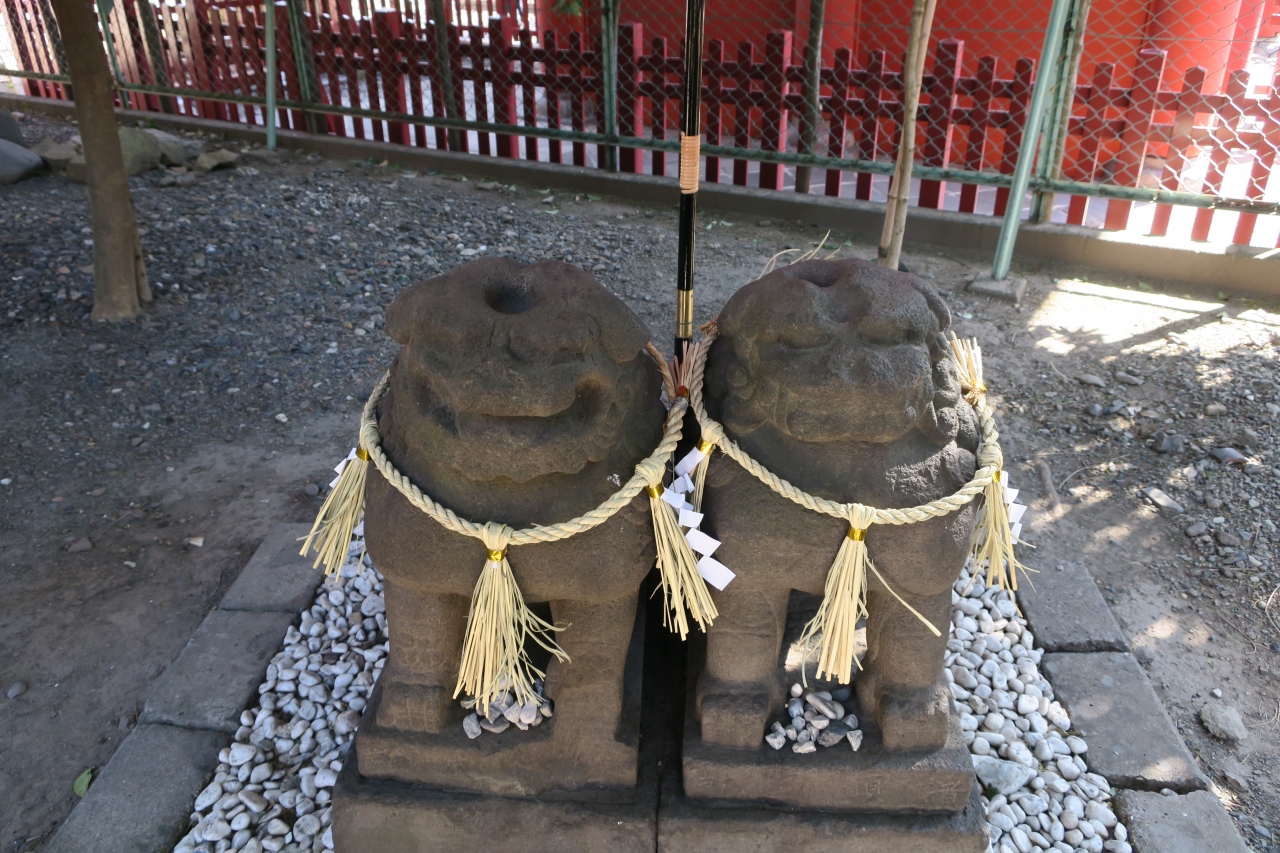 ふつうの狛犬と違って、夫婦らしい2匹の犬がくっついています。
