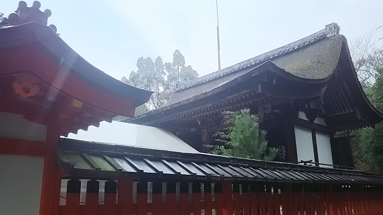 三間流れ造りで桧皮葺の社殿でした。