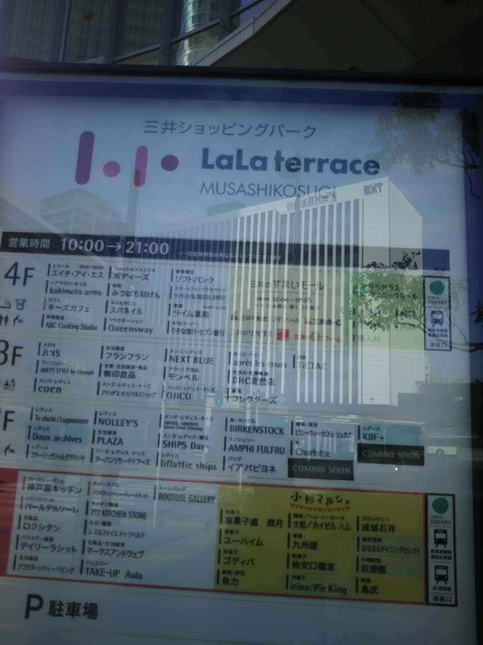 武蔵小杉駅前のショッピングセンターです。三井不動産ののららぽーとのシリーズの小型のショッピングビルです。アパレルファッション、靴、雑貨、無印良品などもありました。1階のは小杉マルシェには地元の店があり、みていてもたのしいです。