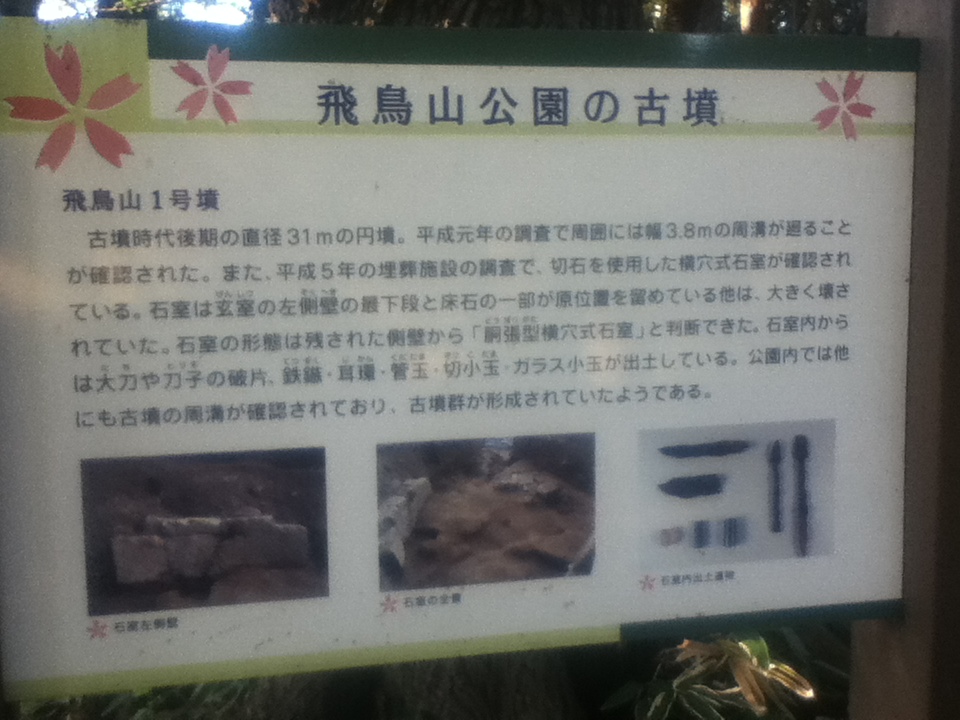 飛鳥山公園の東側エリアに、雑草が生えている小高い丘がある。近くに飛鳥山の古墳と題する説明板が立っている。それらによると、この丘は平成元年の調査等により発見された古墳時代後期の直径31mの円墳であり、横穴式石室や土器も発見された。初めて知り、興味深く周囲を見ることができた。お勧めの点は、この古墳は飛鳥山古墳群中、残されている唯一の墳丘で見学する価値があること、説明板には発掘時のカラー写真とともに説明されており飛鳥山の古墳や遺跡について理解を深められること、これらを見て当時の人々の生活を楽しく想像できること、遺跡発掘の技術が優れていることが理解できること、駅から近くにあることである。