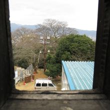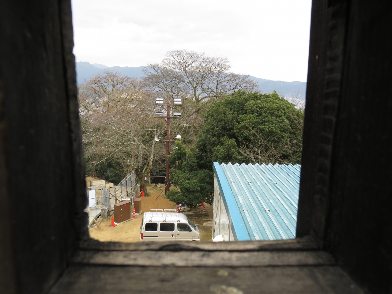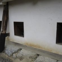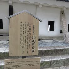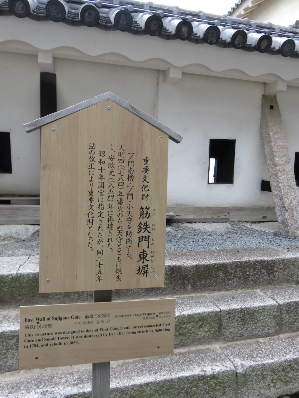 三の門南櫓と筋鉄門を結ぶ渡塀で、塀には9つの鉄砲、矢狭間があり、1か所に石落としの場所があります。存の塀で、重要文化財指定です。外を覗いてみると、丸見えですから、敵の動きが一目瞭然で、城の防御設備が良くわかる塀です。