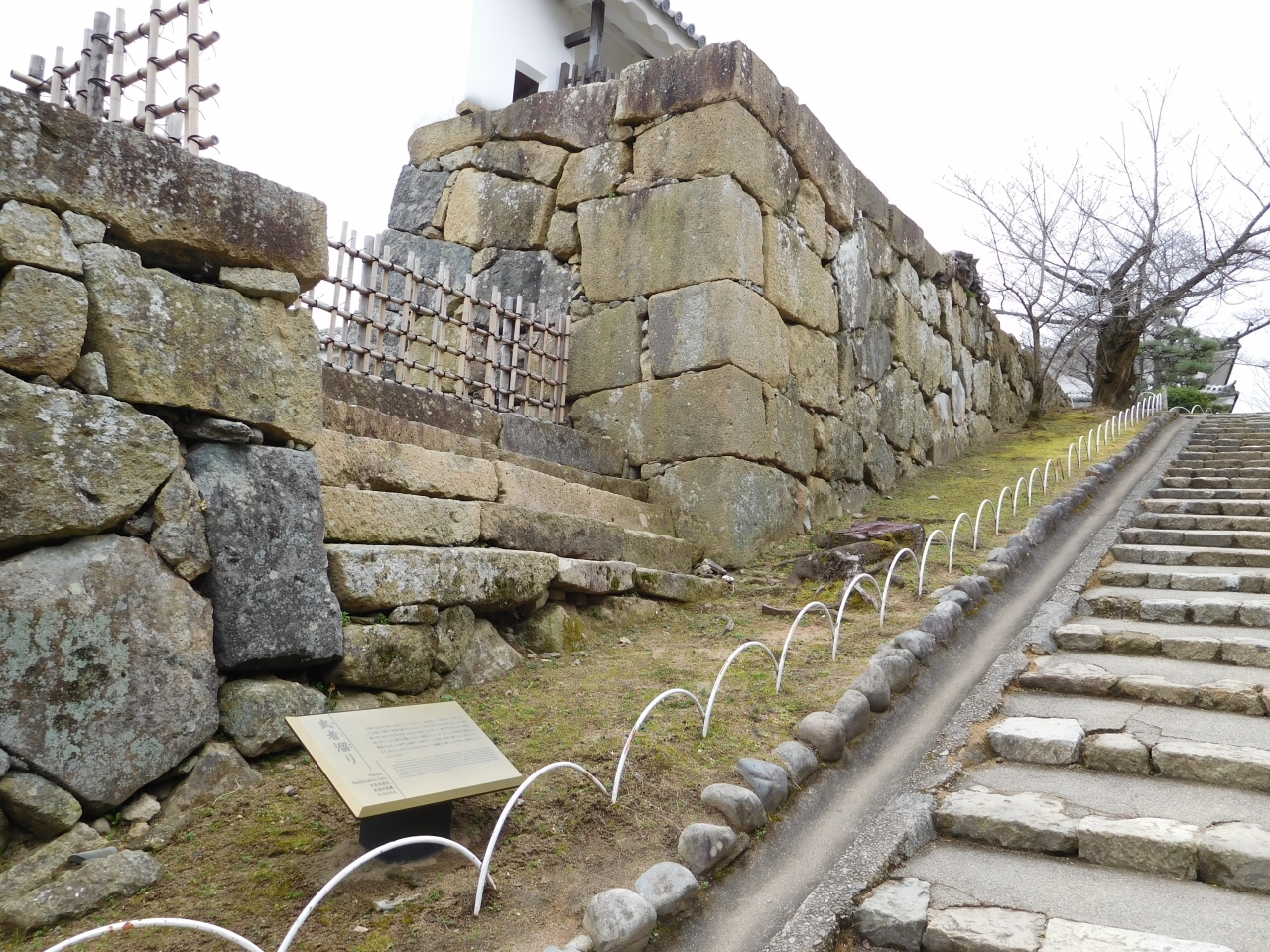 姫路城の菱の門を過ぎ、西の丸方面へと向かう階段の途中に「武者溜り」の案内がありました。武者(兵士)が隠れているのが分かりにくいようになっている場所です。確かに説明文がなければ気づかずに通り過ぎてしまうような場所でした。姫路城内には、他にも武者溜りとなる場所があるようです。