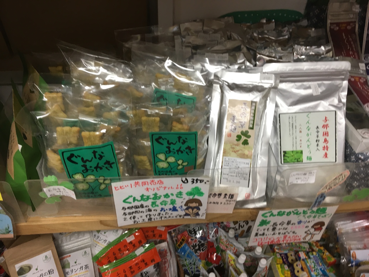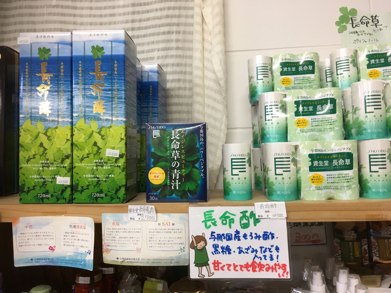 比川にある売店で、店の外観が青いので、すぐにわかります。店の前に駐車場がありました。共同売店限定の与那国産の長命草や天然塩で作った「ぐんなおかき」を買うためにいきましたが、長命草の青汁とか長命草の酢とか、ディープなものも売っていて、面白いです。