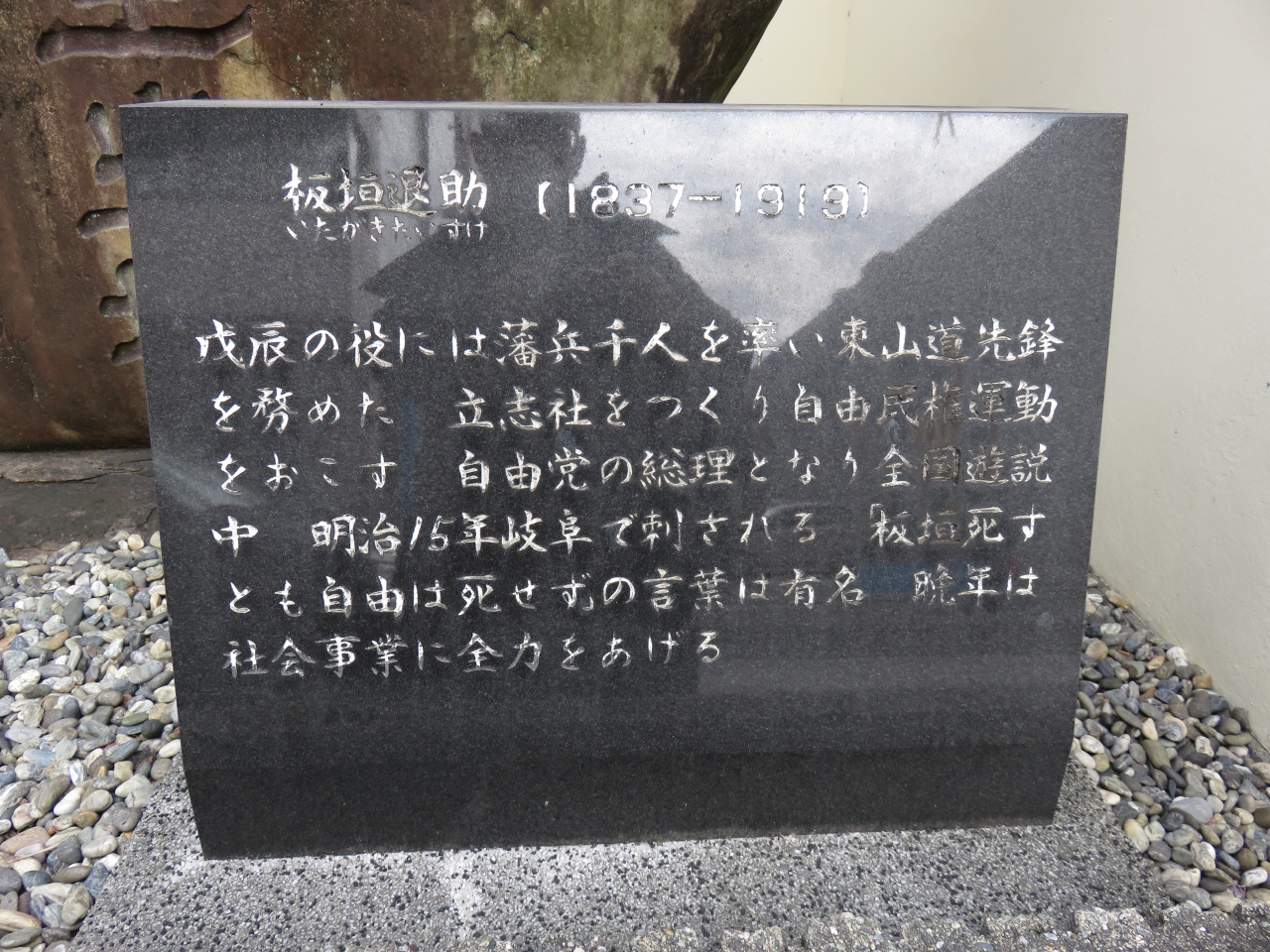 遊説 途中で暴漢に襲われ、「板垣死すとも自由は死せず」という有名な言葉を残した偉人が生まれた場所を印てます。