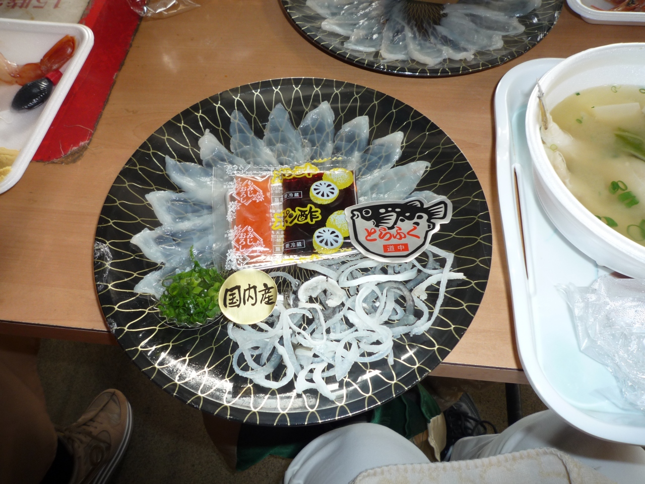 - フグ刺しをその場で買ってセルフサービスでテーブルへ運ぶ