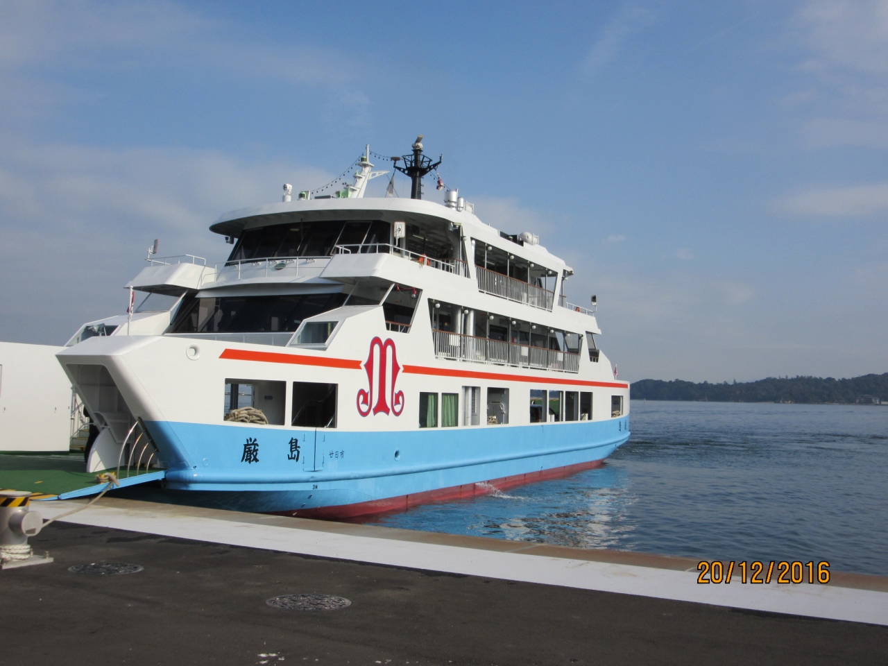 宮島駅から島へ約15分間隔で運行していて10分の船旅です。JRのフェリーと競合していますが、広電の一日乗車券(840円)に含まれているのでいつも広島から市電に乗り、このフェリーに乗り継いでいます。普通に購入すると往復360円です。思ったより広くて揺れもほとんどなく、特に島に近づくと赤鳥居、厳島神社、弥山の景観を楽しめます。