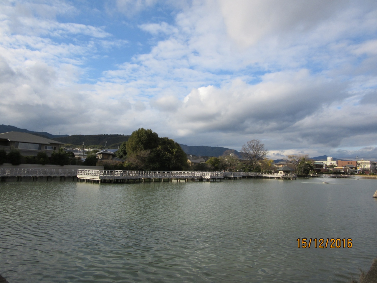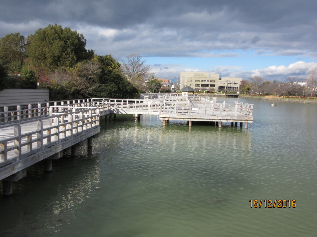 長岡駅から天満宮に着くと向かって右側に白くて長い橋が大きな池にかかっていた。興味が湧いたので歩いてみた。橋は広く揺れもなくて池の上で風が吹き抜けて心地よかった。渡り終えて左側に出てしばらく行くと【天満宮】に戻った。小学生と思われる団体が明るい声をあげて歩いていた。長岡天満宮と池の良いアクセントのなっていた。