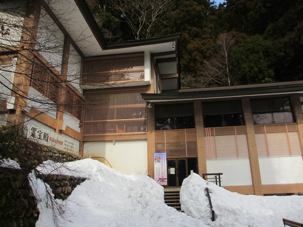 鞍馬山ケーブルカー山頂駅から徒歩15分くらいのところに建っています。冬季閉館中なので本殿金堂にお参りして寄らずに降りる人もいます。鞍馬山の自然、火祭などの展示と仏像奉安室があります。訪れた2月中旬は閉館中で入口部分の雪かきはしてありましたが、建物の周囲は雪が積もっていて霊宝殿から先へ進む道の一部が凍っていて転びそうになりました。注意が必要な道ですので木の根道へ行かれる際は気を付けて歩いてください。開館している時に再訪しようと思います。