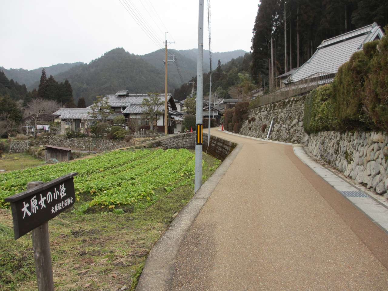 大原バス停を中心として西の寂光院、東の三千院と勝林院を結ぶ徒歩用の小径です。寂光院方面は畑や民家の間を通る細い道になっています。三千院方面は川沿いになり土産物屋やしば漬け屋が点在し食事が出来る店もいくつかあります。個人的には寂光院方面の道がのどかで好きです。時間があるならば車で直接寺院に行くよりこの小径を歩いて参拝することをおすすめします。