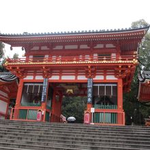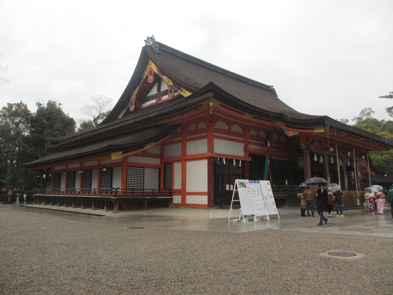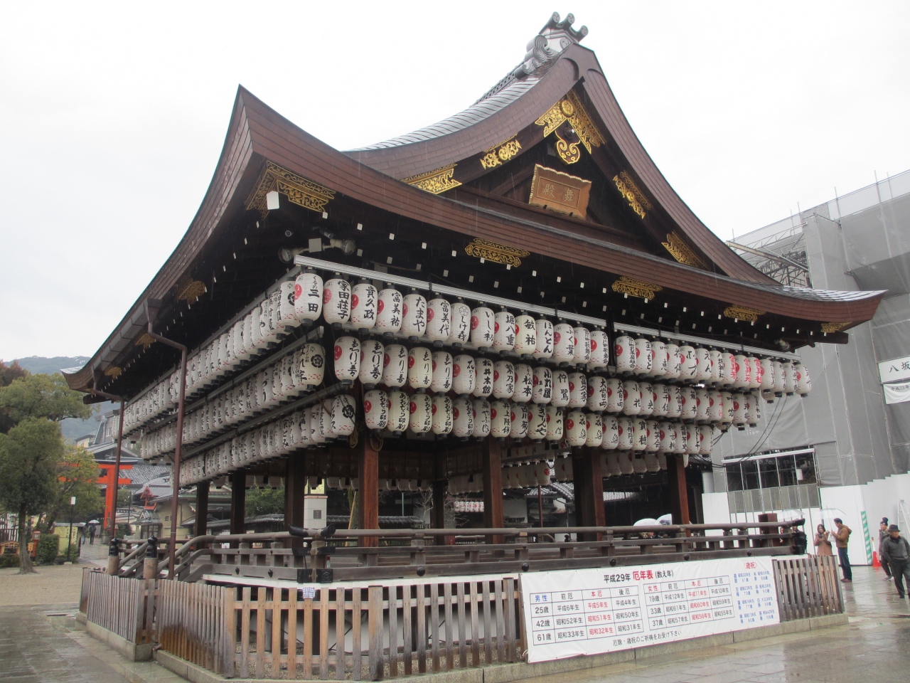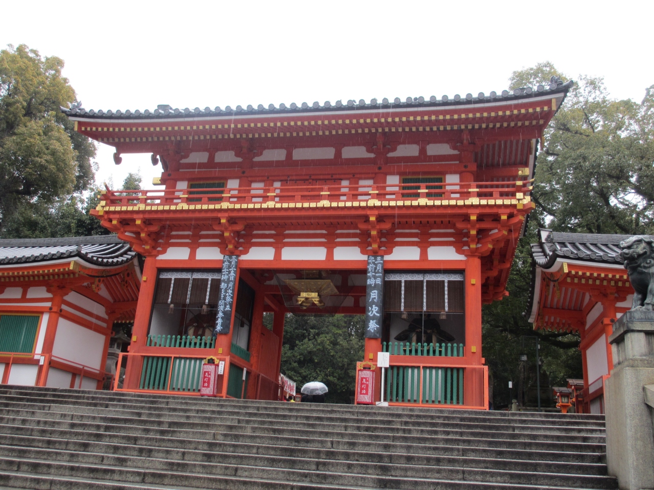 雨の降る2月に訪れました。国内外の観光客と参拝者が多く訪れていました。傘を差しながらのお参りは自然と短くなりました。本堂には素戔嗚尊をはじめとした神々が祀られています。朱色の柱と白壁が美しい建物です。向かいにたくさんの提灯で飾られたどっしりとした舞殿があり、対照的でした。少しにぎやか過ぎて神聖な場所というより観光スポットになっていて残念です。観光客が多い祇園だから仕方ないのでしょう。祇園へ来たら寄ってみてください。熱心に参拝する人と着物を着てはしゃいでいる人たちがいます。
