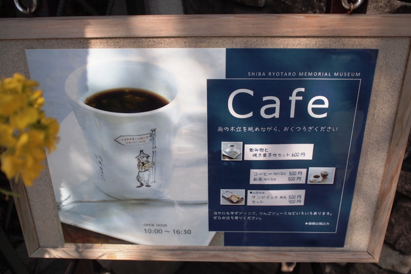 地下のホールでビデオを二本見たあと入口左にあるカフェでまったりしました。菜の花の季節に合わせた和菓子と抹茶セットを頂きました。コーヒーカップはオリジナルで「街道を行く」の挿絵を担当した画家の絵が描かれた物でした。