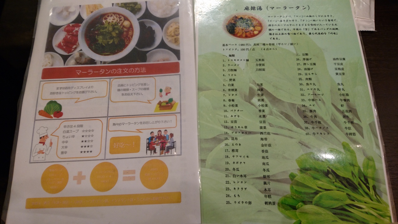 麻辣湯は自分で具や麺の種類(春雨、刀削麺など)辛さを選べます。