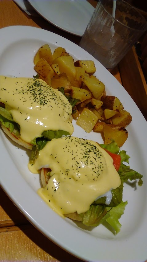 エッグベネディクトも、パンに半熟卵を乗せてベーコンとかを