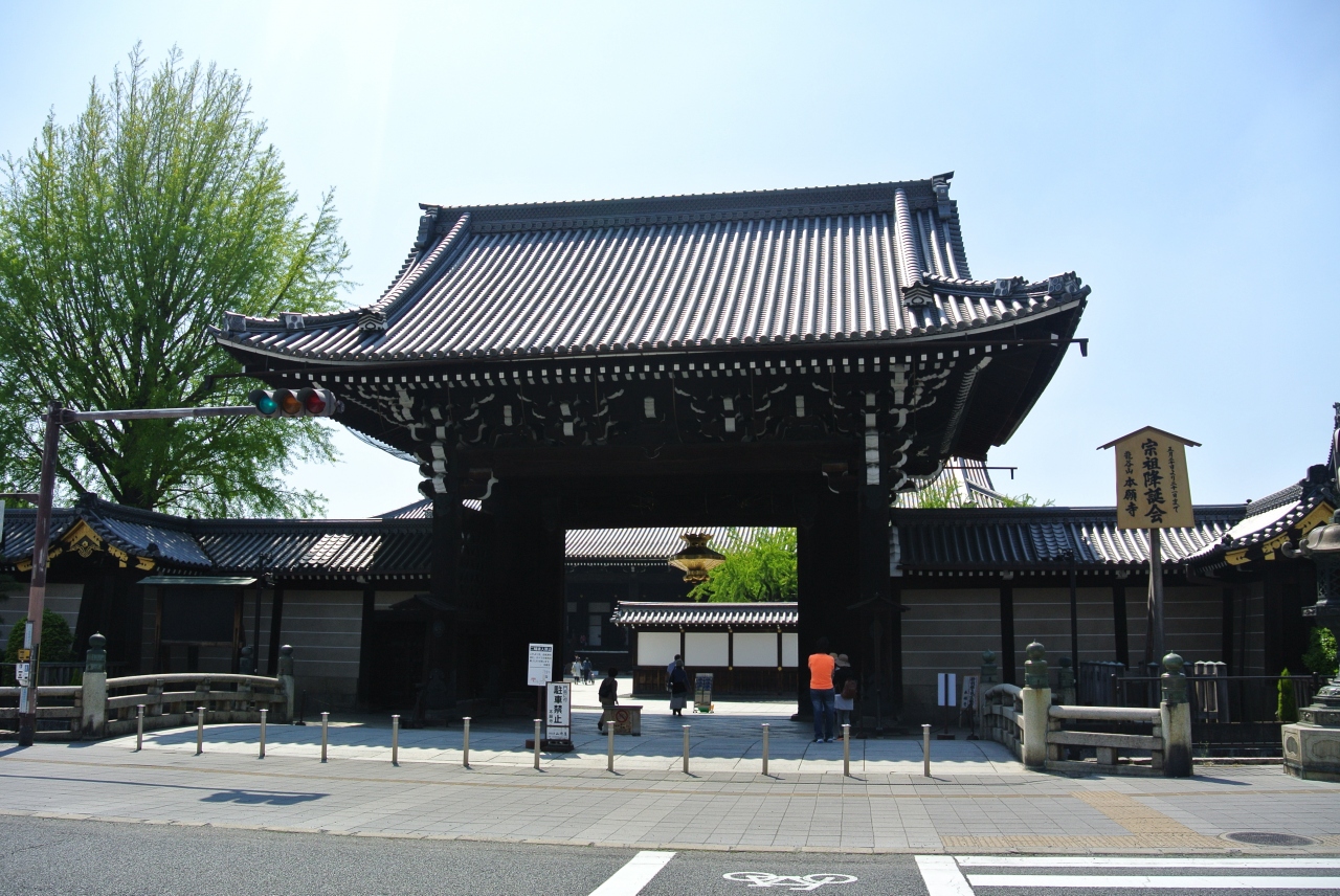 大きな境内の西本願寺にはたくさん門がありますが、これは堀川通りに面した比較的大きな門です。彩色や金箔などの装飾はなく、どちらかといえば質実剛健な感じがしますが、屋根の反りなど、堂々とした門構えが印象的です。