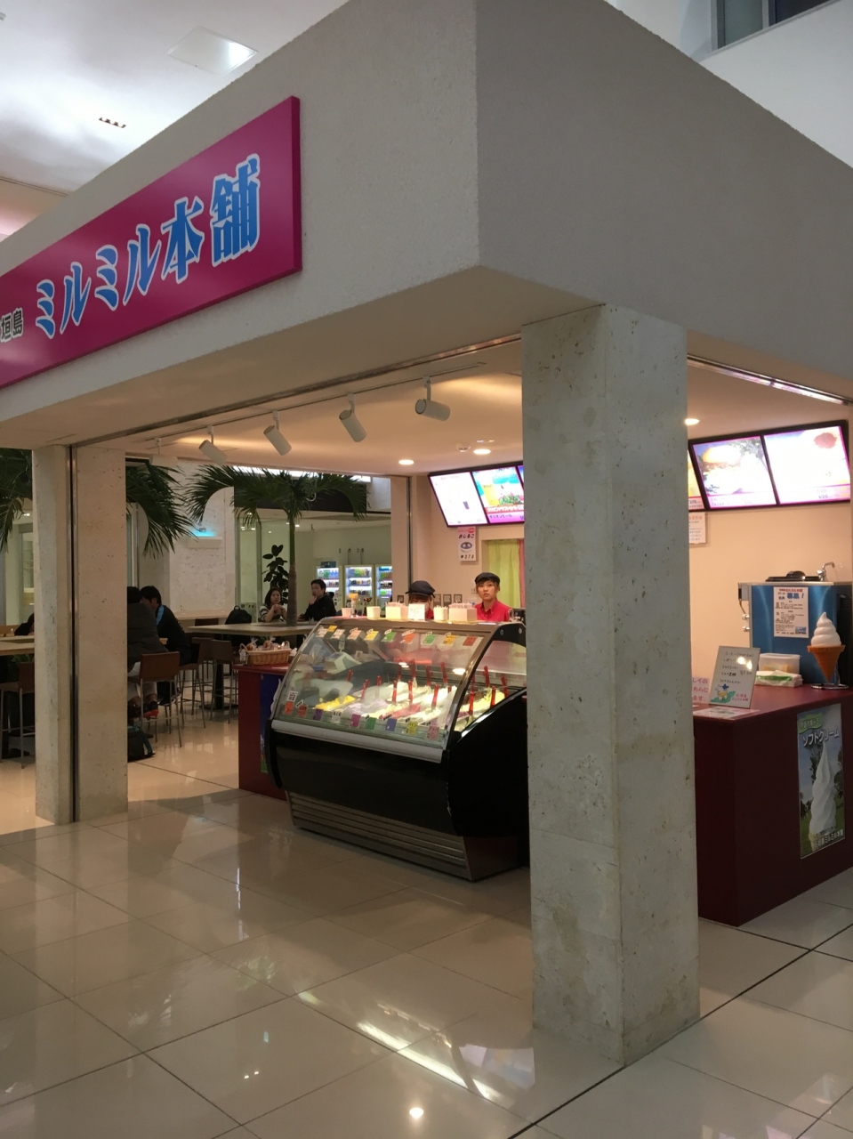 石垣空港一階のフードコートの一角にありました。とても目立っていました。ジェラードの種類も豊富です。席はフードコートなので、他の店と共用ですが、食後のデザートとして食べることができました。出発待ちにオススメできるところです。