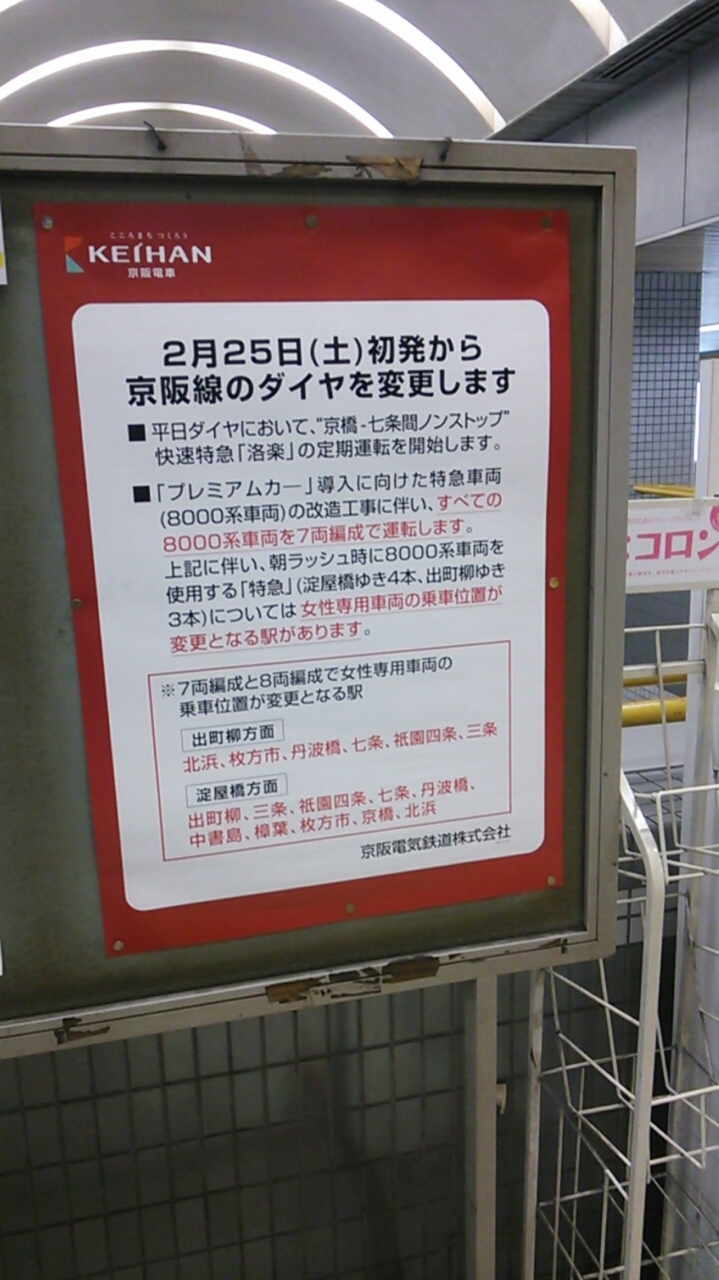 当日は伏見稲荷駅から祇園四条駅まで乗車したところ、2月25日付けでダイヤ改正が行われる旨の掲示がありました。