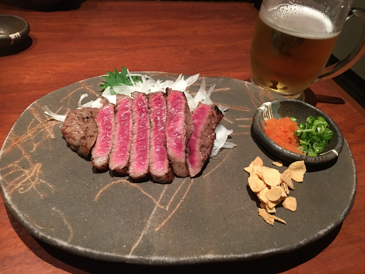 我が家はいつも哲サラダとタタキ風ステーキからスタート。その後は店主お任せ盛り…ですが、お任せ盛りの内容が固定したのかな?日替りが楽しかったんだけど。確認すればよかった、次回の宿題にします。