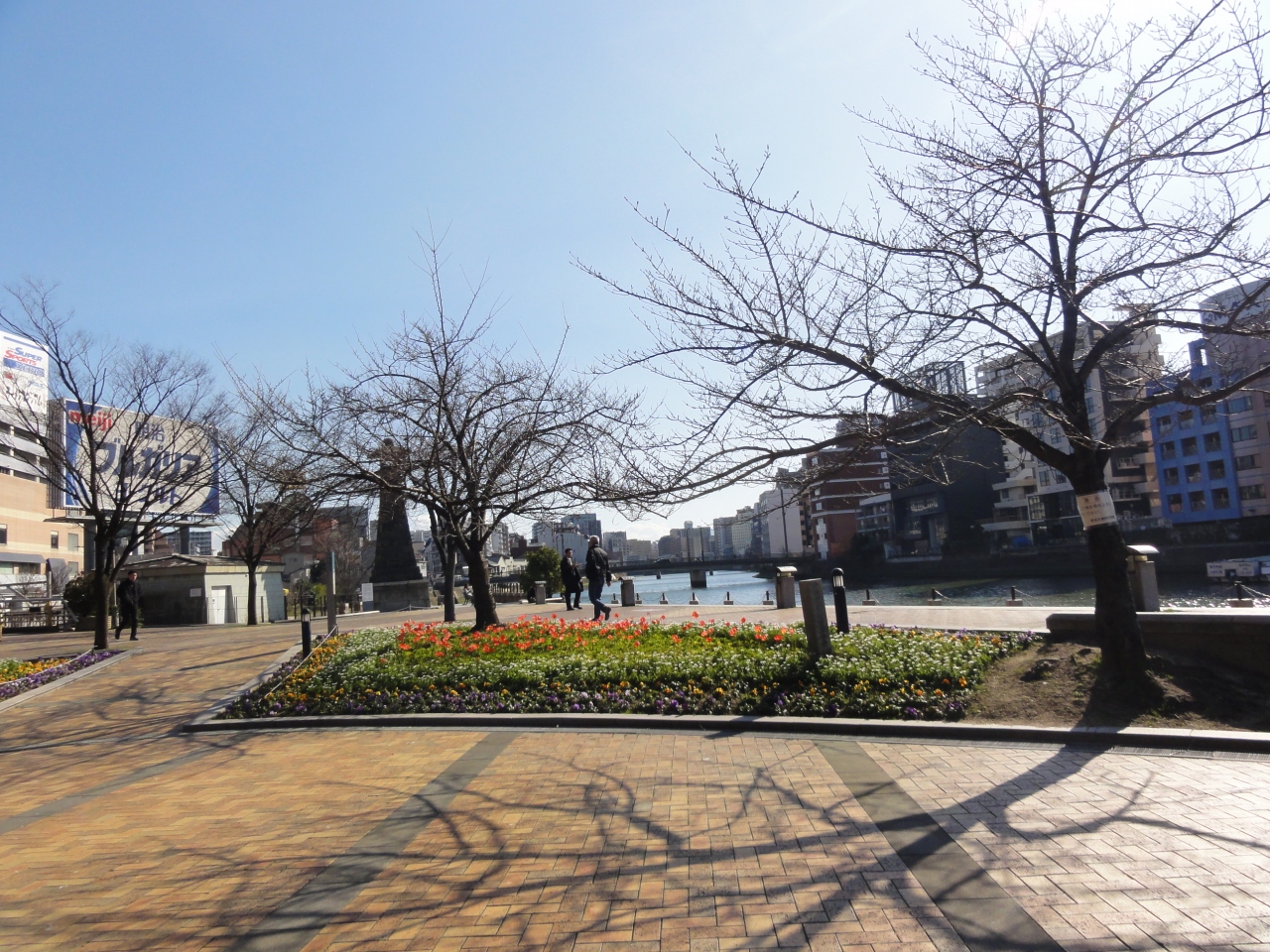 前回は夜でしたが、今回は日中、弟を案内して行きました。キャナルシテイを出てすぐ博多川と那珂川に挟まれるようにあります。高い灯籠も建っていたのですね。那珂川沿いの風景が爽やかでベンチで一休みしました。都会のオアシスの雰囲気、名前の通り川が見える公園はいいなと思いました。