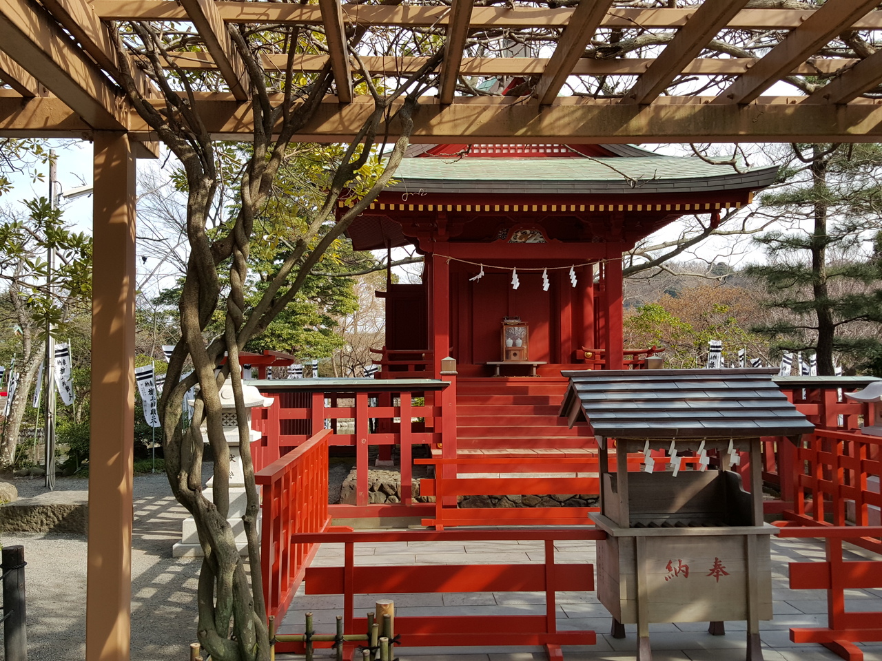 鎌倉鶴岡八幡宮の境内、源平池の源氏池側の島に鎮座しています。