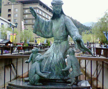 JR下呂駅から歩いて15分ほど、下呂温泉の温泉街に架かる白鷺橋の上にある銅像です。