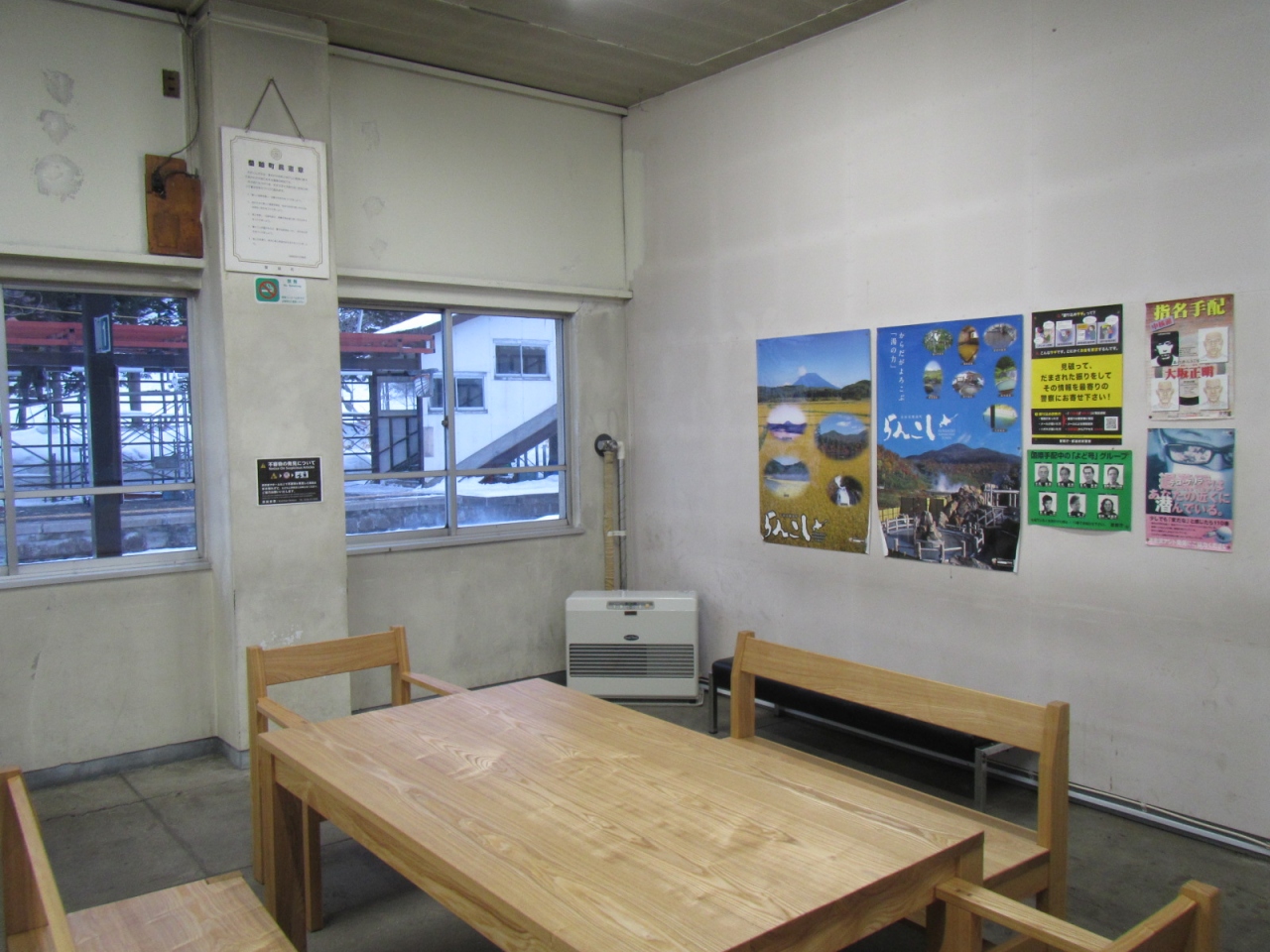 椅子とテーブルの備えられた待合室があり、冬はストーブがついていて、暖かくなっています。