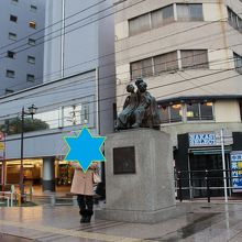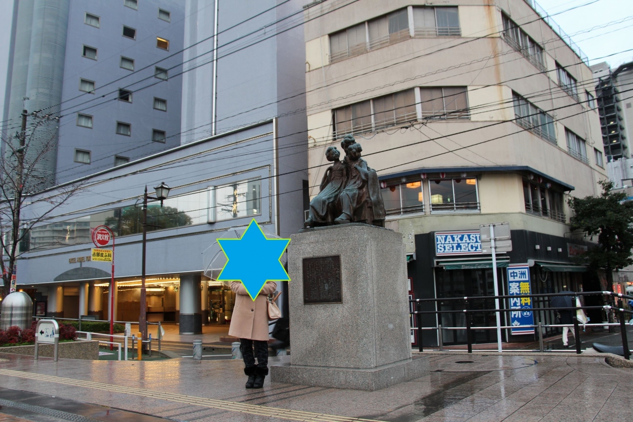 博多中州「福博であい橋」博多側のたもとに建つ三人の舞妓の銅像です。