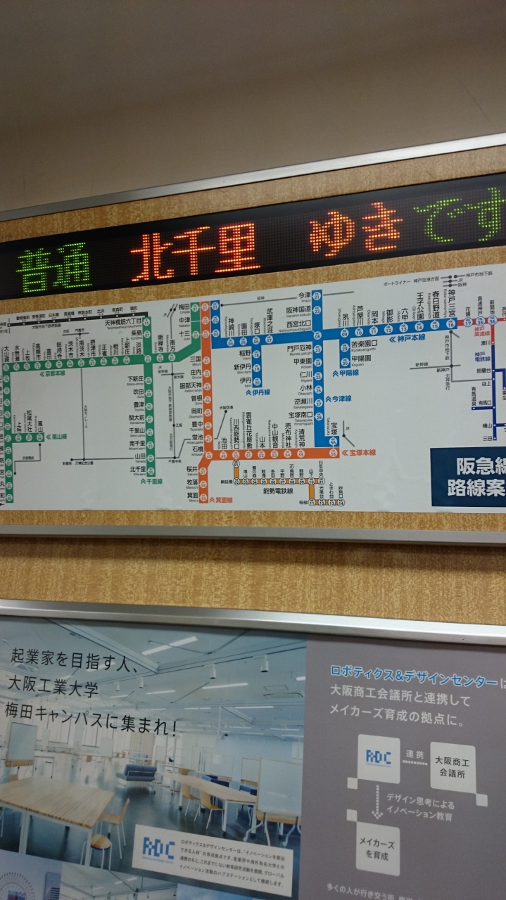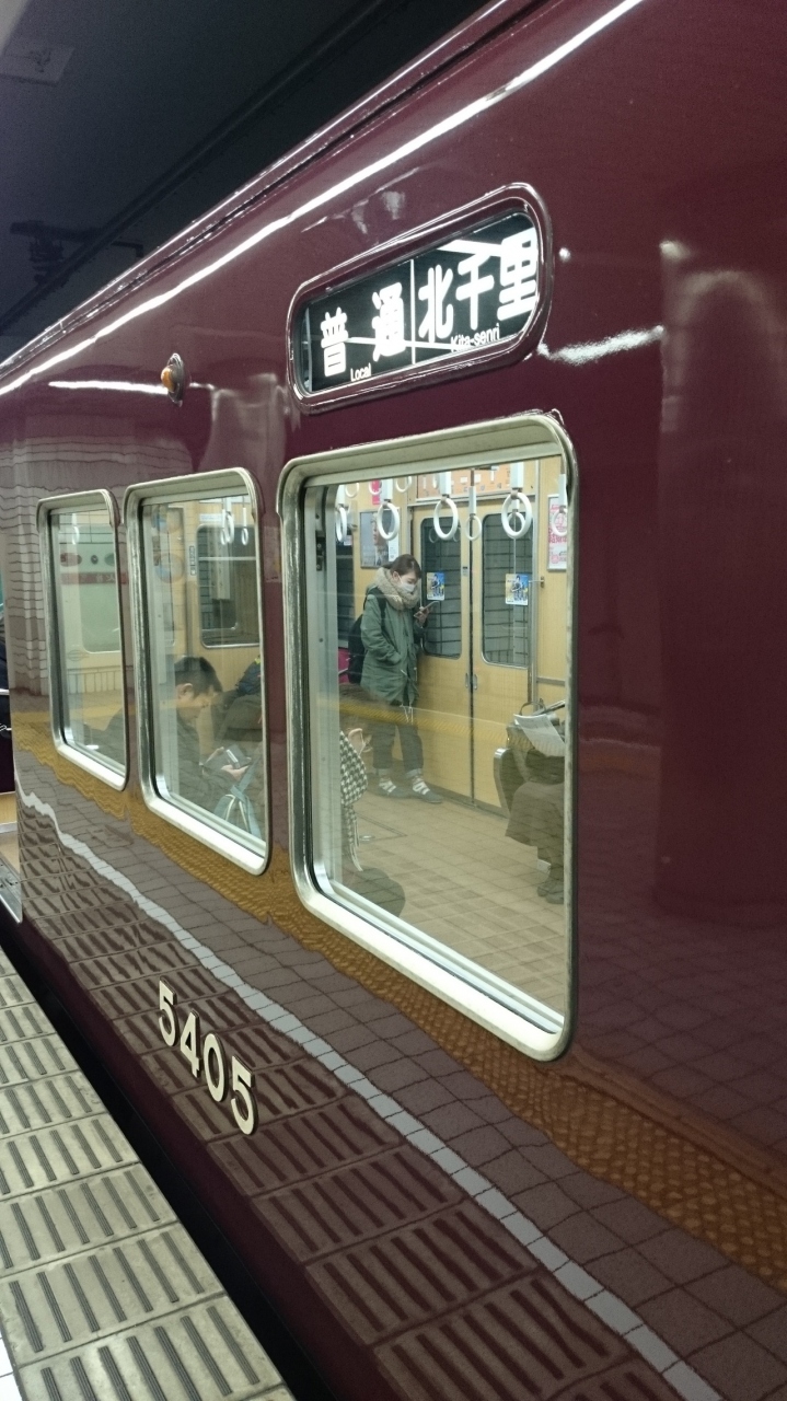 地下鉄・堺筋線に乗り入れしている、阪急電車です。天神橋筋六丁目駅から北千里駅までが、本来の区間ですが、天神橋筋六丁目駅から天下茶屋駅も乗り入れしています。朝夕はラッシュで混雑します。最近は外国人さんも多いですよ。