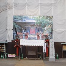 「少彦名(すくなひこな)神社」は、静岡浅間神社の北側、参拝者用駐車場に近くにあります。訪れた時はちょうど工事中で、全体が工事用のシートですっぽり覆われた状態になっていて、仮設のお賽銭箱が設置されていました。かなり大がかりな工事のようで、参拝するにはちょっと味気ない雰囲気で残念でした。