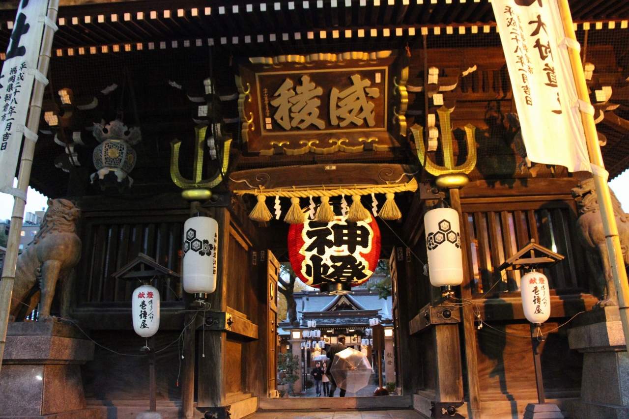 櫛田神社の正門にあたる門がこちらの「楼門」。