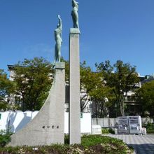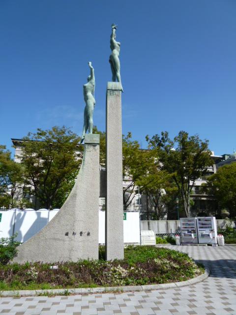 大阪の中之島公園を土佐堀川に沿ったプロムナードに沿って歩いている時に見つけました。コンクリートの生の高い二本の台座の上に裸婦像を二体載せたモニュメントで、40年ほど前に設置されたものとのこと。丁度雲一つない快晴の中散策していたこともあり、天に向かって腕を伸ばした姿が実に清々しく感じられました。