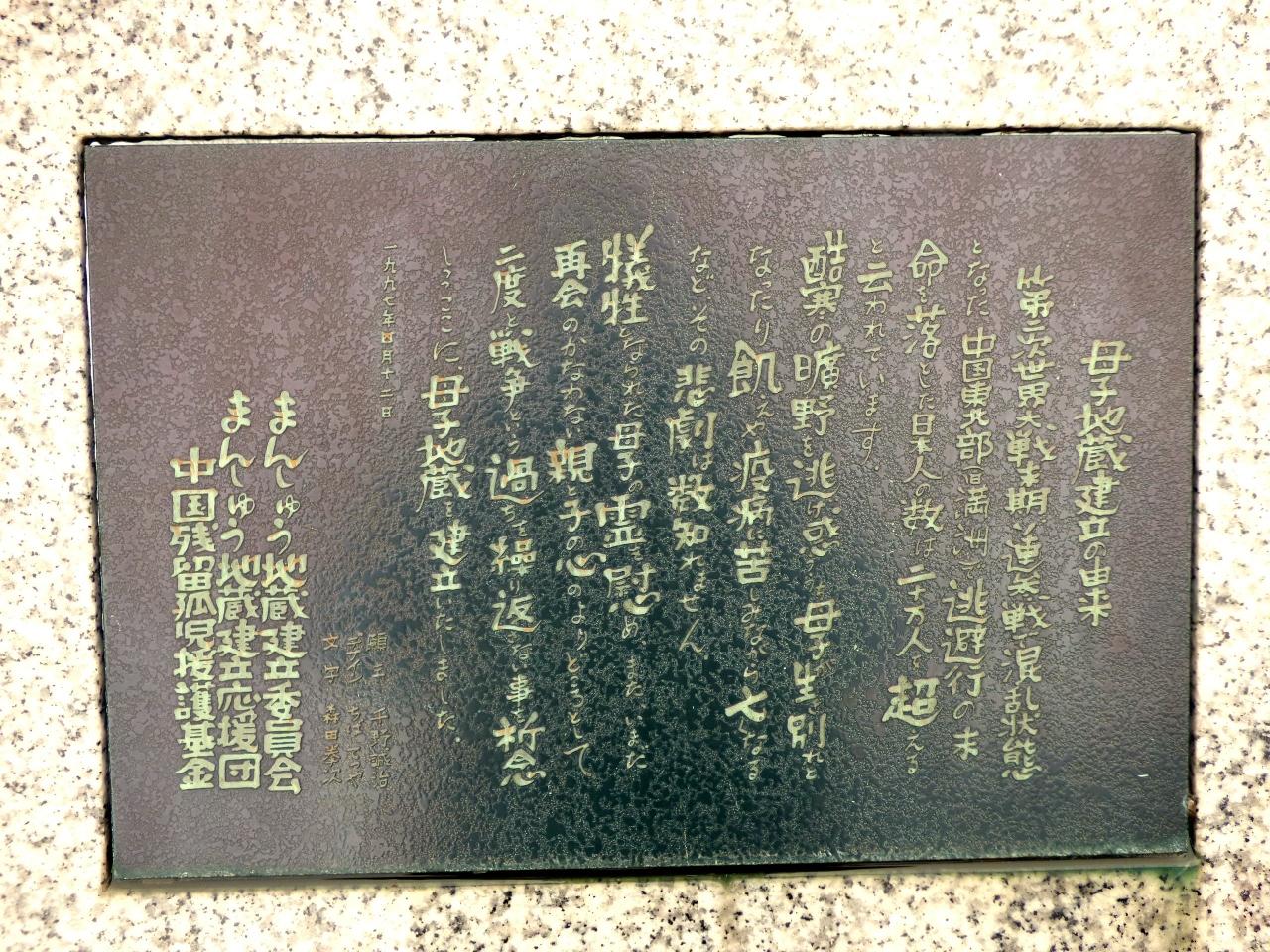 母子地蔵は、終戦後の混乱の中で日本に帰ることができなかった人々の霊をなぐさめるため建立されました地蔵尊像で、参道の喧騒から少し離れているせいか、寂しげな感じの空気を醸しています。