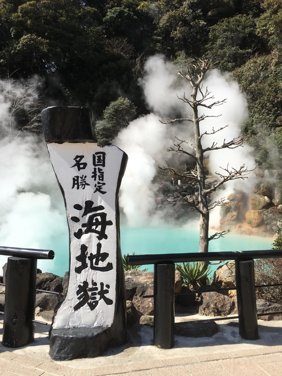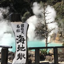 温泉は大きな青い池のよう。ちょっと小高いところに展望台があり、上から全内を眺めることができます。湯気はちょっと熱くて、高温ということがわかります。