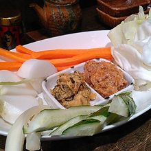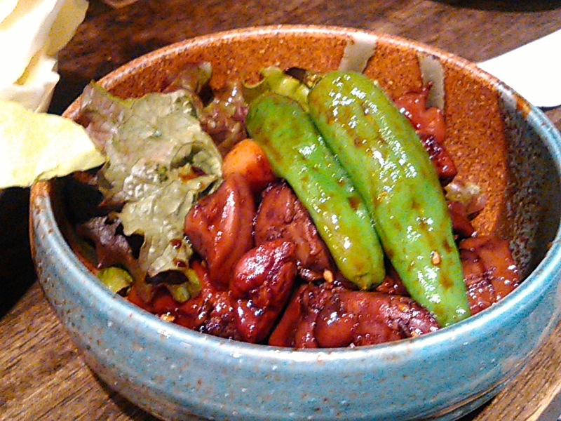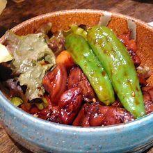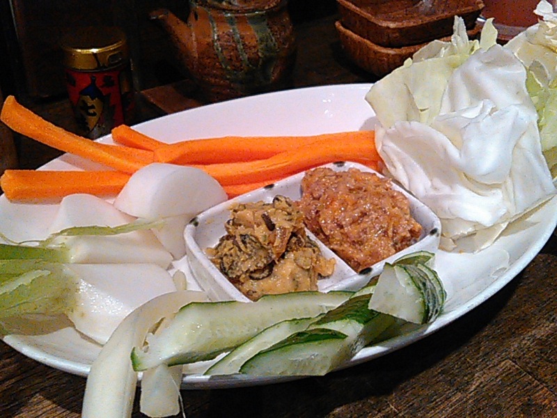 和風のお店はカウンター席と小上がりの座敷(掘りごたつ式)がいくつか。たくさんある味噌ディップから2種類選んで野菜に付けて食べたり、甲州B級グルメ「鳥もつ煮」やその他郷土料理がいろいろあったり、お料理はどれも庶民的でおいしい。地酒は山梨・長野のもの中心なのも特徴が出ています。
