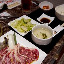 和牛上バラ、海老焼き、野菜、キムチ(自家製)、サラダ、ライス、スープ、ソフトドリンク、デザートから成る。
