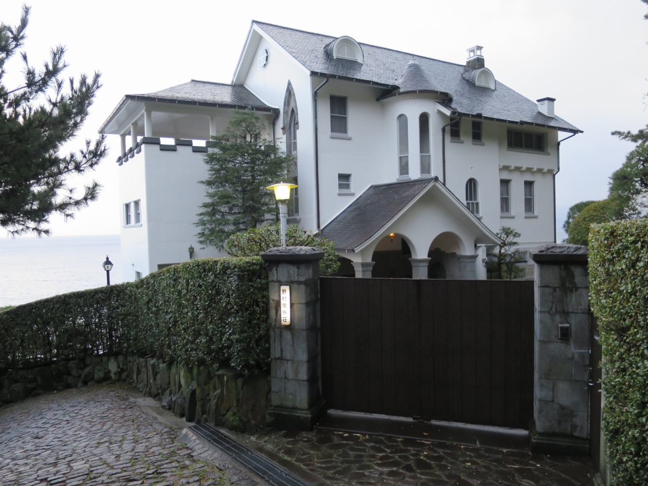 国道135号線の伊豆山エリア、海光町の石畳地区に野村證券創業者の野村徳七の熱海別邸 野村塵外荘はある。熱海観光では知る人ぞ知るレトロ感たっぷりの風情が残る石畳築でひと際目立つ白亜の洋風建築。昭和14年に建てられた歴史ある建物で、近代洋風建築好きには一見の価値ありです。公開されていないので、外から見学する以外できないですが、まったく古さを感じさせません。テラスが印象的なスパニッシュ風住宅は海をバックに、とても見事です。内部が公開されたら是非見学したい建物です。