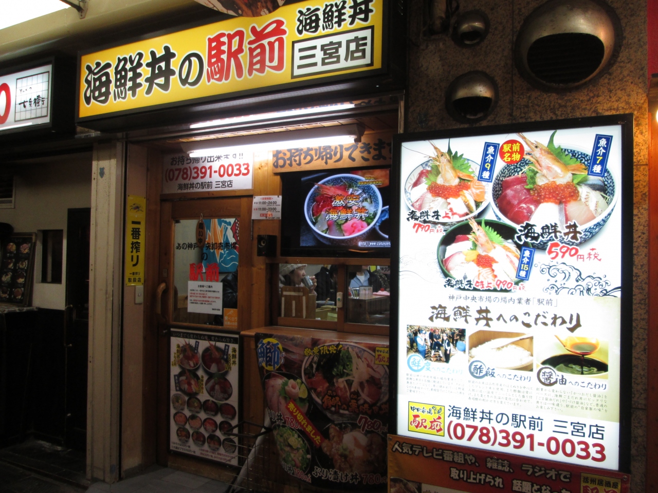 海鮮丼が590円+税で食べられます。この価格でも7種類の魚介がのっています。この価格は一度食べる価値があります。阪急の神戸三宮駅からすぐの便利のところにあり、カウンタのみのお店で、時間によっては席が埋まっています。でも丼物ですので、回転は速いように感じました。
