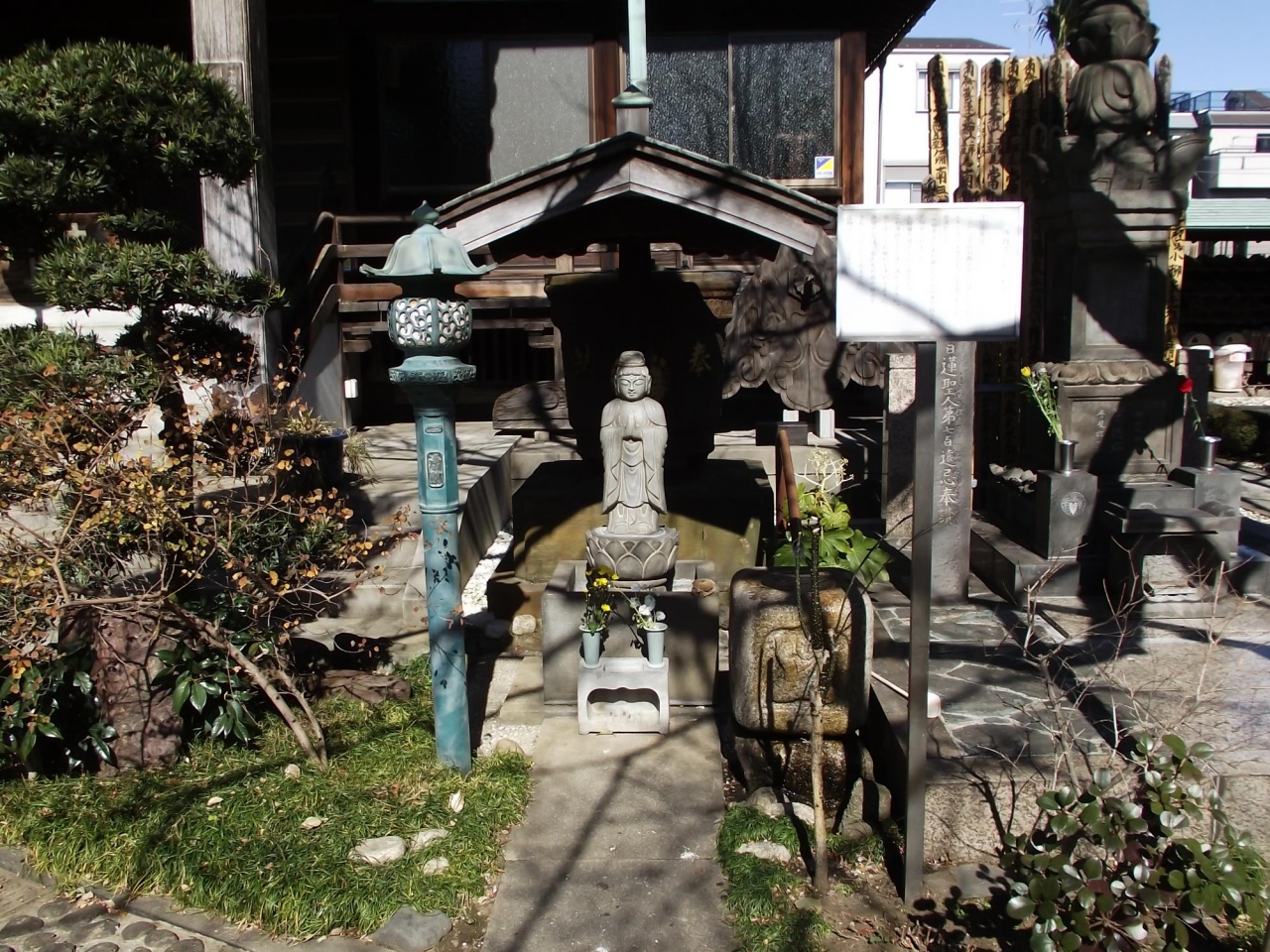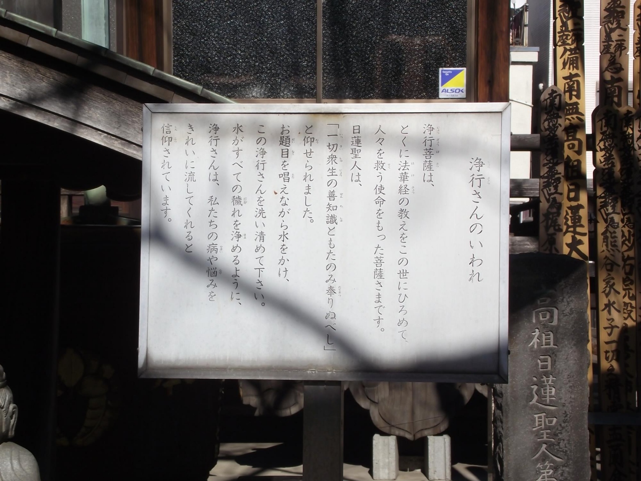 また本堂前に立派な鐘楼があり、右手には題目を唱えながら水をかけると御利益があるいわれる 浄行菩薩像 が祀られています。