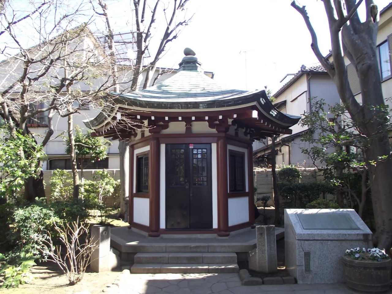 入って行くと正面に六角堂があり、中に岡倉天心の坐像が安置されています。