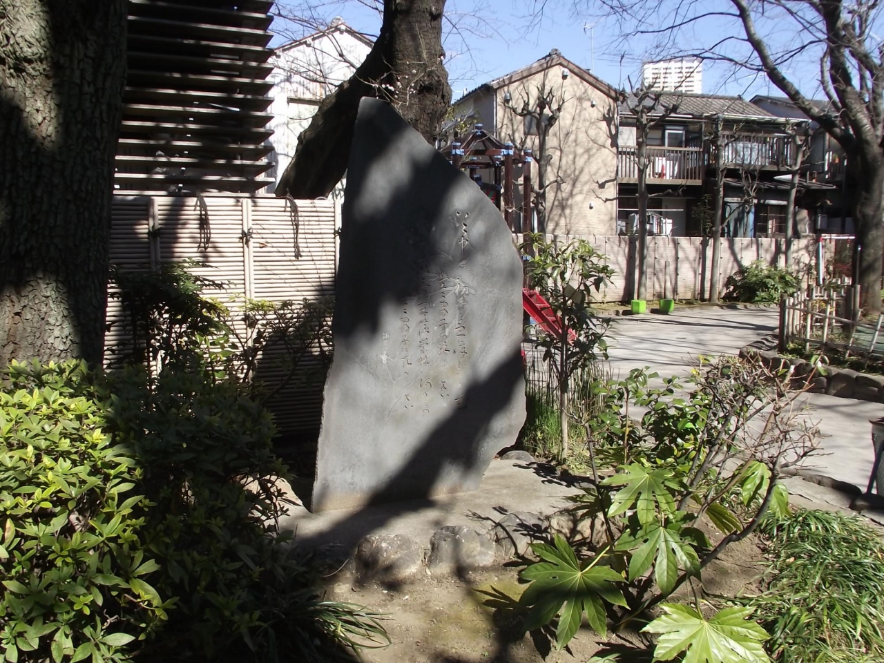 通り沿いの出入口はそれ程広くなく、「東京都指定旧跡 岡倉天心宅跡 旧前期日本美術院跡」 という説明板や石柱があるところです。