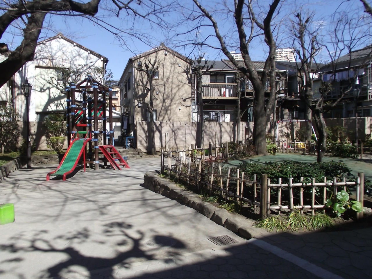 谷中ぎんざ商店街の南側で寺院が並んでいる静かな通り沿いにある細長いあまり大きくない公園です。