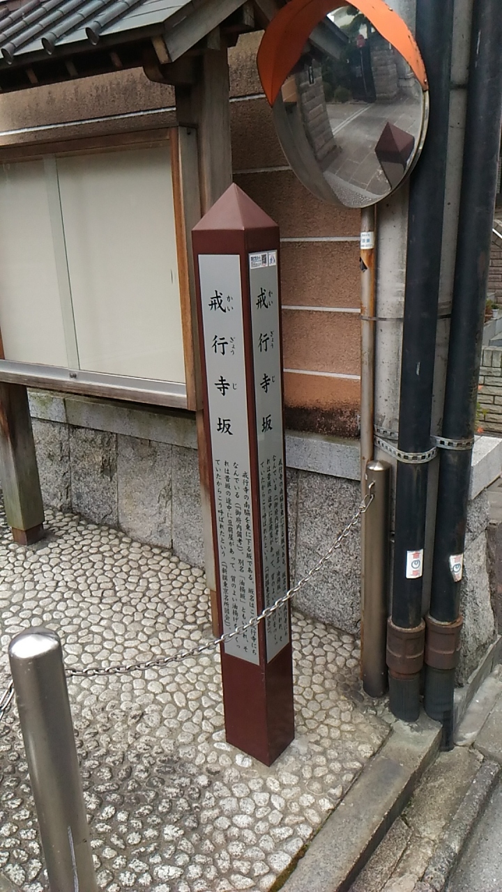 JR四ツ谷駅の赤坂口から徒歩10分くらいです。この四ツ谷周辺は、谷の字が付くだけあって色々な坂が存在します。坂の名前の由来は当然戒行寺から来ていますが、別名、「油揚坂」と言われていたそうです。なんでも昔、坂の途中に豆腐屋があり質の良い油揚げをつくっていたからとか。勿論、寺はありますが豆腐屋の痕跡はありません。