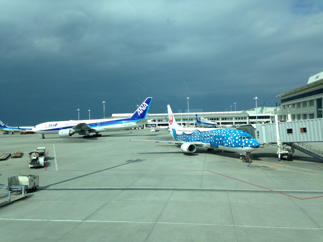 搭乗口から見ると飛行機の後ろには青い空が広がり、きれいな景色でした。お土産屋さんもレストランも充実していて早めに着いても時間を過ごせます。沖縄弁当が売っていて興味を惹きましたがサーターアンダーギーをばら売りしているお店で揚げたての品が陳列されていたので、そちらを購入しました。来た時は最終便だったのでコンビニしか開いていなかったのですが帰る時はお土産屋さんが多く楽しめました。
