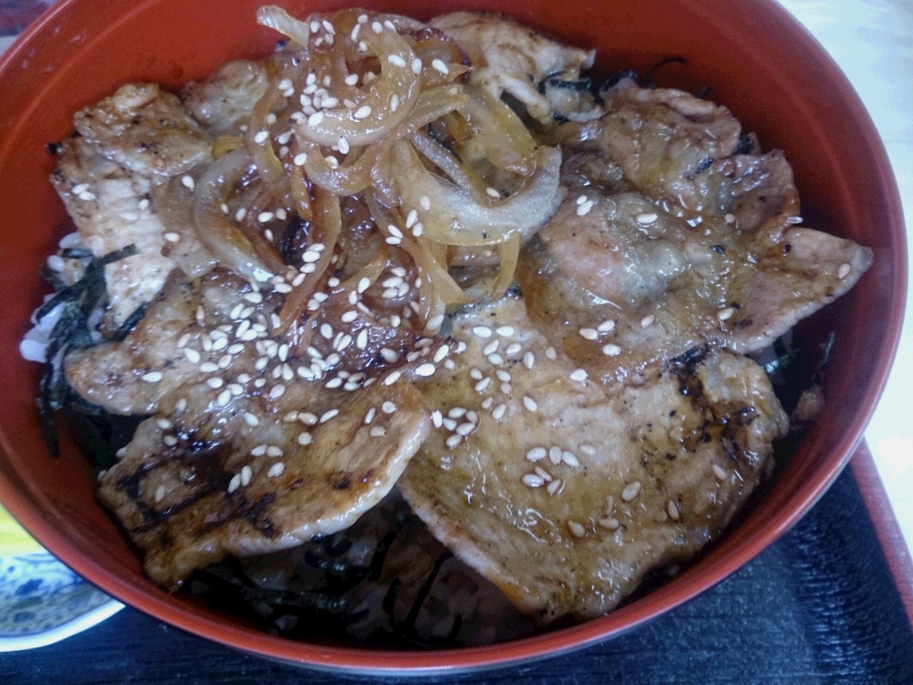 さっそく、看板にあった「豚丼」を注文しました。待つこと10分、醤油たれの香ばしい香りとともに豚丼登場。これまでに食べた豚丼よりはるかに厚い豚肉に、甘じょぱいタレが食欲をそそります。ボリュームもあり、たいへんおいしく、なぜこの味が生まれたかの思いをはせながら、いただきました。ま、お世話になりたいお店です。